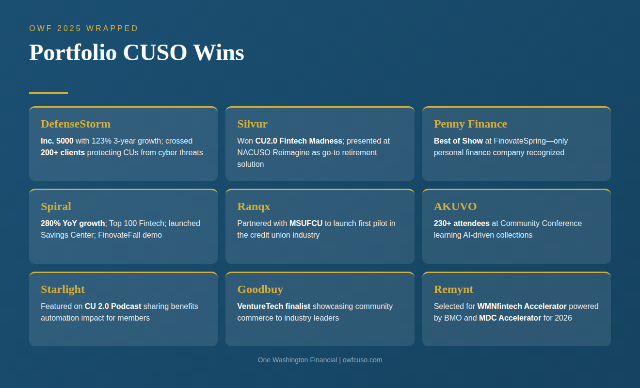2025 was an impactful year for One Washington Financial, WSECU’s CUSO holding company. We evaluated more opportunities than ever, welcomed nine new CUSOs into our portfolio, celebrated a successful exit, and deepened our commitment to the credit union mission through pilots, partnerships, and thought leadership.